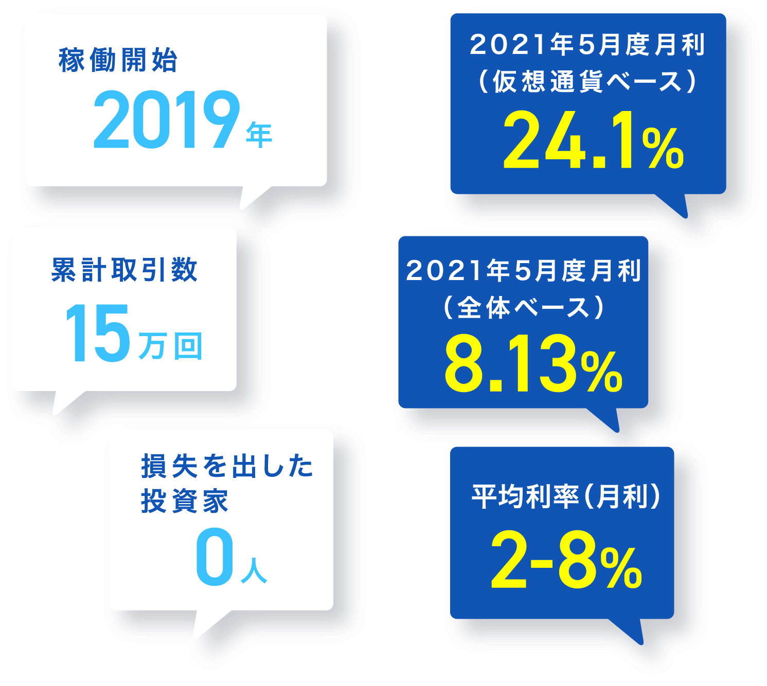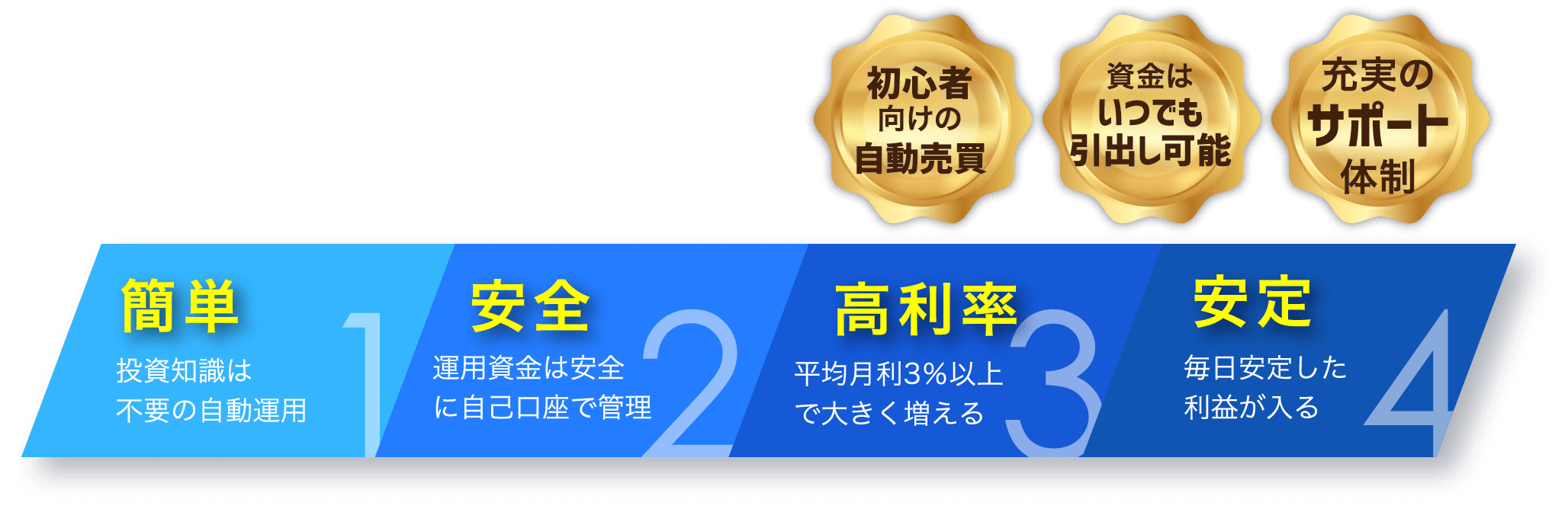 ローリスクでハイリターンの「エクレア」は利率の月利2〜8%ととても魅力的。少額からの投資でも高い利益性と複利運用により、資金を将来的に大きく増やす事が可能です。 ローリスクでハイリターンの「エクレア」は利率の月利2〜8%ととても魅力的。少額からの投資でも高い利益性と複利運用により、資金を将来的に大きく増やす事が可能です。